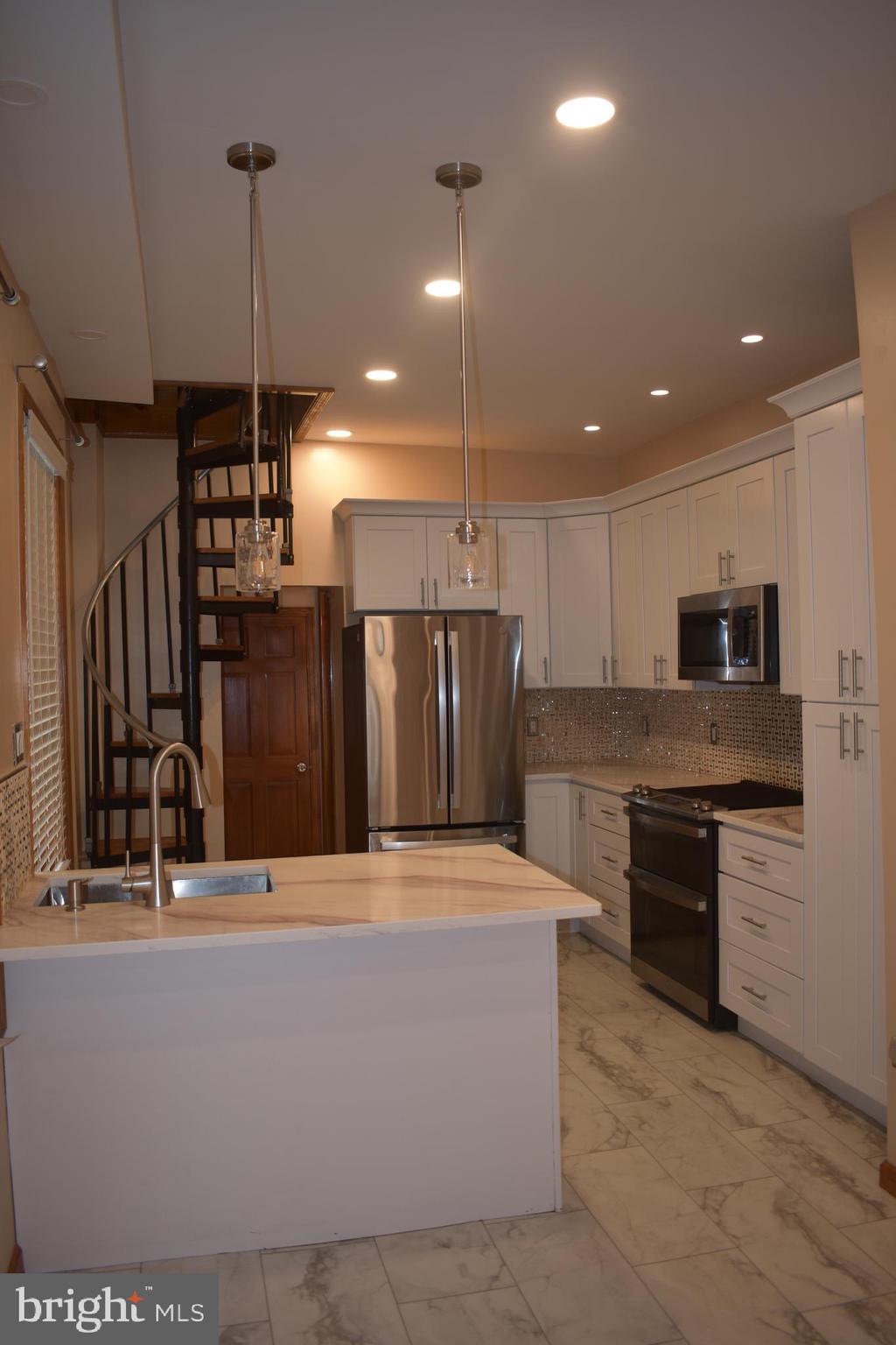 Welcome to 1411 N 56th St, a spacious 3-bedroom, 1.5-bath home that blends style and comfort in the heart of West Philadelphia. Step inside to a grand living room featuring two striking spiral staircases and plenty of natural light. The gorgeous eat-in kitchen has been beautifully updated with brand-new quartz countertops, sleek stainless steel appliances, and ample cabinet space perfect for both cooking and entertaining.